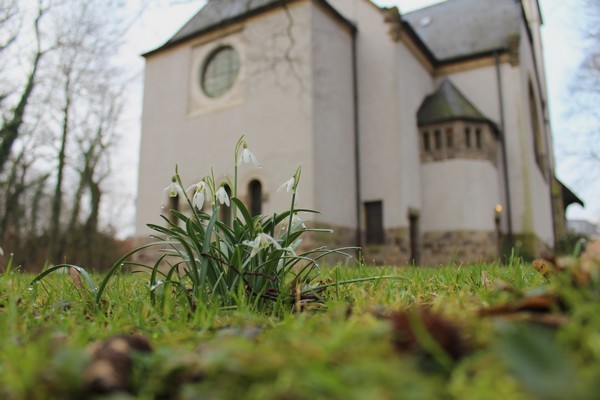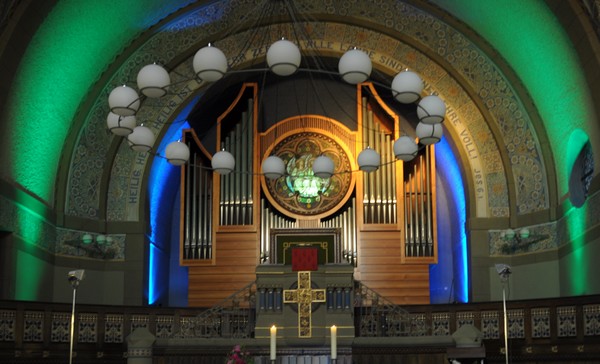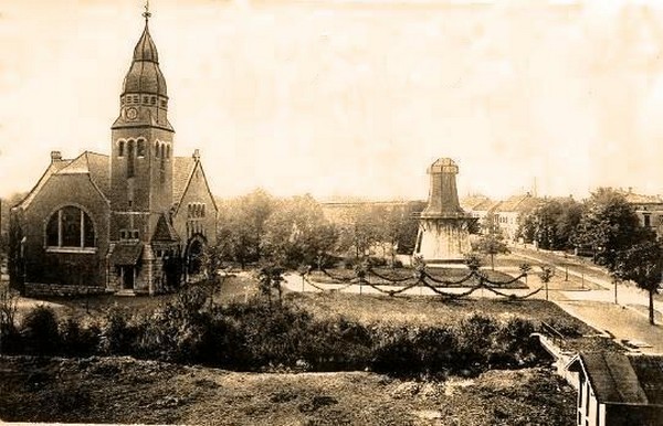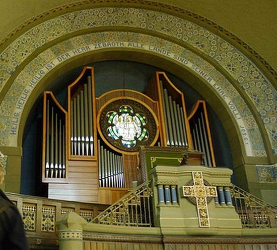 Das Gotteshaus an der Friedrich-Ebert-Straße wurde 1905 eingeweiht. Es entstand als Zentralbau. Es wirkt gedrungen und nicht sehr groß, hat aber doch 450 Sitzplätze. Der Architekt nahm durchaus historisierende Formen auf, vor allem außen, aber er kopierte sie nicht einfach, sondern zitierte und veränderte sie: Rundbögen und Pfeiler in Anlehnung an die Romanik, der Turmhelm nach barocken Vorbildern. Neu für einen Sakralbau waren die schlicht verputzten Außenwände, das kräftig profilierte Sockelmauerwerk verrät den Einfluss der damaligen Burgenromantik. Aber auch außen finden sich schon Merkmale des Jugendstils: Blumenranken und vor allem die Beschläge an den Eingangstüren.