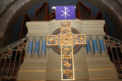 Ihren Höhepunkt findet sie schließlich im vergoldeten Altarkreuz: In der Mitte des Kreuzes die Rose, in den Kreuzarmen Ähren und Trauben als Bezug auf das Abendmahl.